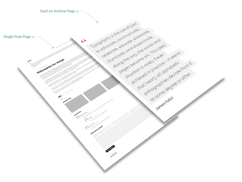 On Single Post page, a big quote will be displayed inside Post Header. On Archive Pages, the Post card has no title or excerpt, but is represented by the quote and, depending on case, by its author.