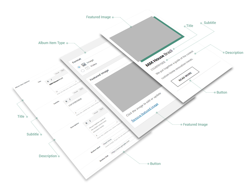An Album Item represents a single element of Album that can be displayed as either card (part of a Masonry) or slide (part of a Slider or Carousel).